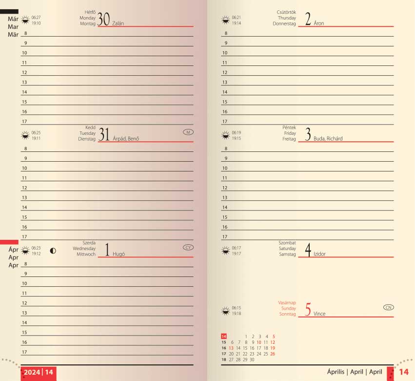 | 9x16,8 cm, 16 oldal információ, 112 oldal heti beosztású naptár, 16 oldal telefonregiszter. Kivitel: fehér papíron narancs-szürke nyomás, műbőr kötésben, sarokperforálva. | ||||